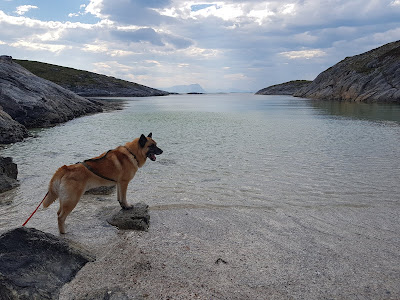 Vi "lånte" en brygge for å lufte bikkjene før vi ankom Svolvær